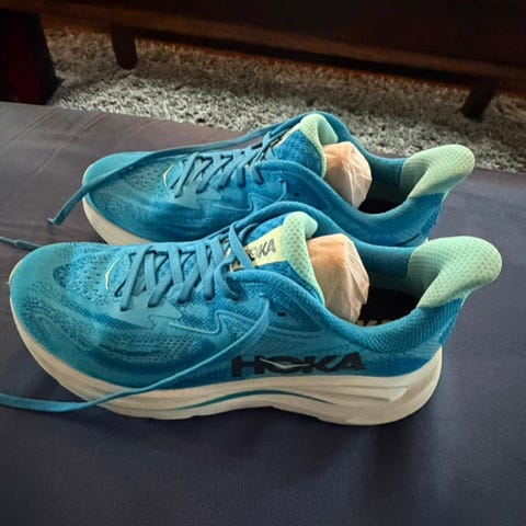 Hoka løpesko i størrelse 44. Egnet for løping med slitesterk yttersåle for godt grep. Farge og materiale er ikke spesifisert.