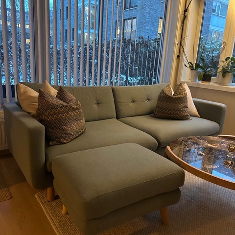 Flott mørkeblå Bolia Scandinavia 2,5-seter med puff. Selges rimelig da den er klort litt på av katter. Alle hjørner ser ut som på bilde over. Røykfritt hjem. Nypris ca 33 000kr. Hentes i 2. etasje på Bjølsen