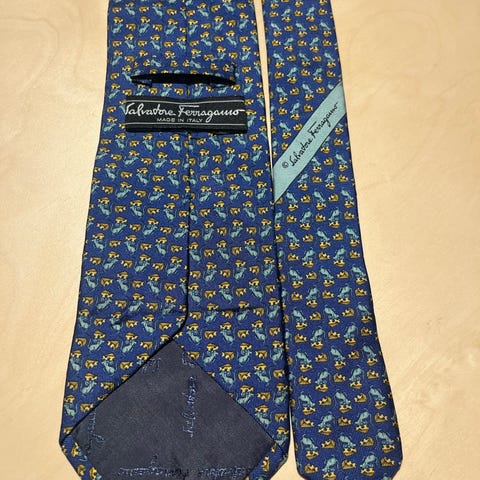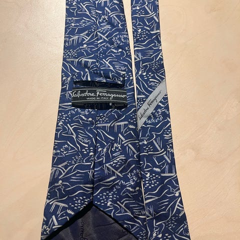 Designer slips fra Salvatore Ferragamo i god kvalitet og med kule motiver. Slipset består av 100% silke og er derfor et slips av klasse. Ansett som en vintage piece, men brukes fortsatt i stor grad i moderne mote. Gjerne kom med spørsmål eller bud. Slipset kan trenges å strykes ettersom det har ligget brettet over lengre tid.