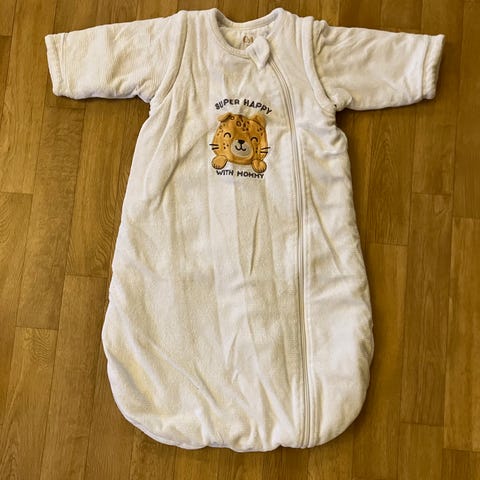 Langermet sovepose i størrelse 56/62. Litt farge som er gått vekk på glidelåsen, ellers pent brukt.