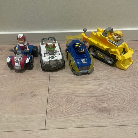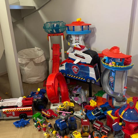 Hei! Selger unna Paw Patrol-samlingen. Det er det store tårnet, en stor lastebil og et Skye-helikopter.