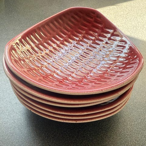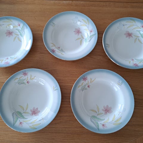 Jeg selger to dype og to flate tallerkner str 22 cm fra Egersund porselen for kr 150 pr stk.