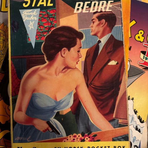 En drøy halvtimen er en tegneserie med illustrasjoner som viser en scene der en kvinne er bundet til en benk i et rom med en bevæpnet mann som sikter mot henne. Serien har en tegneseriestil og benytter farger som gul, rød, svart og blå. HA HA artig hva KI får til😂😂