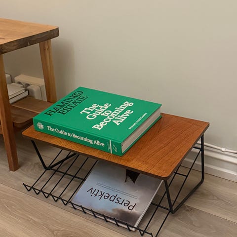 Magasinholder i tre med håndtak og åpen design. Har flere rom for oppbevaring av magasiner eller aviser. Naturlig trefinish med synlige årer og struktur.