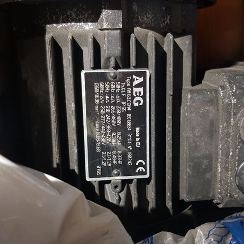 Støvet AEG 5,5 KW 3-fasmotor som kan brukes til litt av hvert . Fin for avtrekk i hobbylakkversktedet ditt. Har stått som korntørke på låve. Ble aldri ferdig med prosjektet mitt så selges slik jeg kjøpte den med over 50% rabatt. Leveres på pall. 220V 3 fas - Må hentes Vormsund. står på pall - kan løftes på henger e.l. med truck