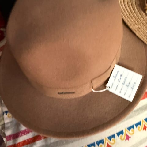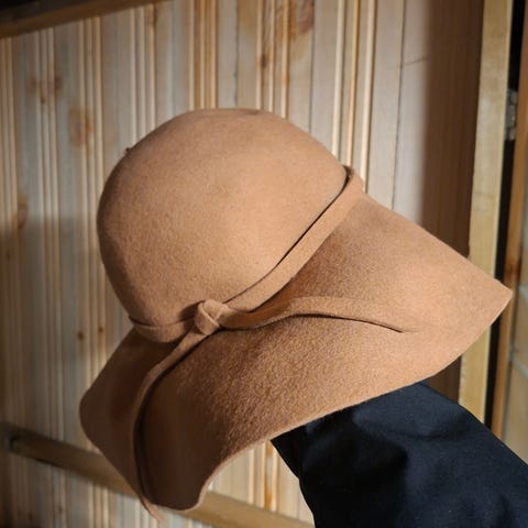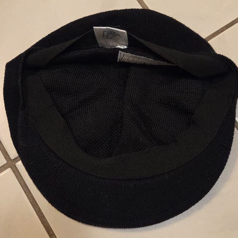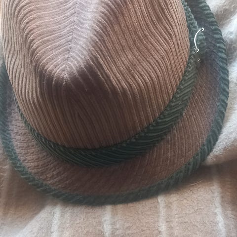 Sort hatt med høy form og rund brem, laget av materiale med pelslignende overflate. Innvendig foret med lyst materiale. Strørrelse ca. 57 cm.