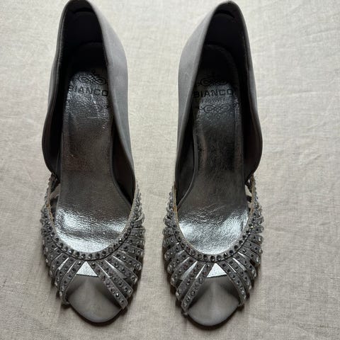 Bianco Hæler i størrelse 38. Skoene har høye hæler og et mønstrete stoffmateriale. Designet for kvinner.