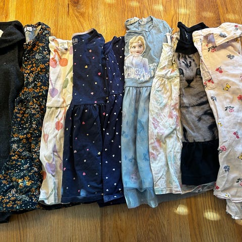 Stor klespakke 98/104 selges. Inneholder vinterdress fra Kaxs, flere jakker i både tykk og tynn, litt tynnull, masse hverdagsklær og veldig mange kjoler. Badetøy og ubrukt uvdrakt. Mye er godt brukt, derfor selges det veldig billig. Hundehår forekommer.