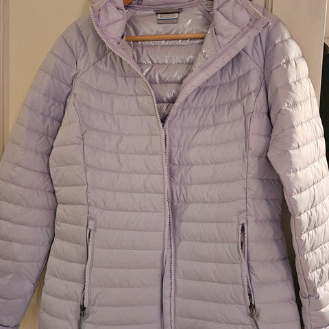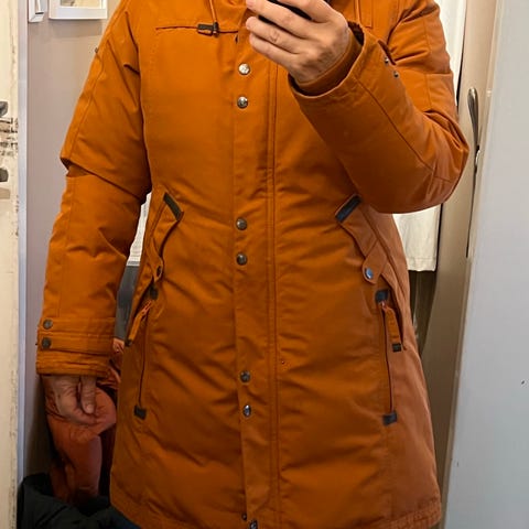Lacoste dunjakke i størrelse M for dame, er brukt til alpint, men kan også fungere som vinterjakke. Jakken er svart og har hette. Den egner seg for utendørsbruk og har en enkel, funksjonell design. Litt liten i størrelsen, kan passe en liten M eller en S