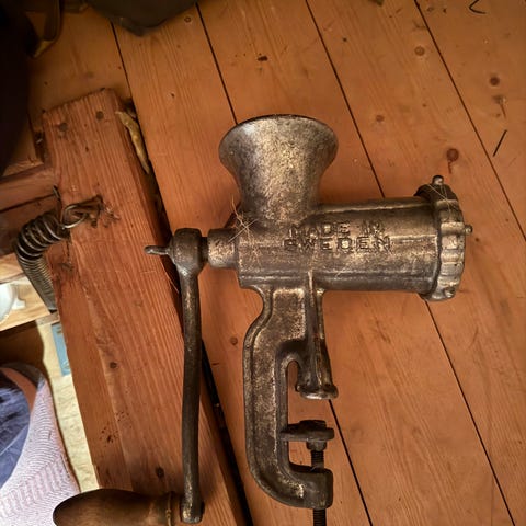 Ubrukt håndkvern med 2 foskjellige hullskiver og en kniv. Den kan settes fast på underlag med sugekopp .