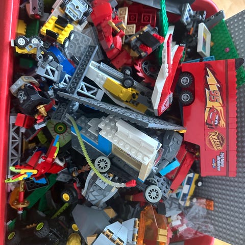 LEGO byggeklosser med flere deler i ulike farger og former. Inkluderer små og store klosser, figurer, og tilbehør. Inkluderer også Super Mario klosser.