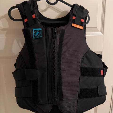 Airowear Junior Outlyne ridevest i størrelse Y5 Regular. Brukt av barn 8-10 år. Ridevesten er svart med blå detaljer og er laget for å gi beskyttelse ved ridning. Den oppfyller BETA 2009 Level 3 standard for hesteryttere, og dekker bryst, rygg og skuldre.