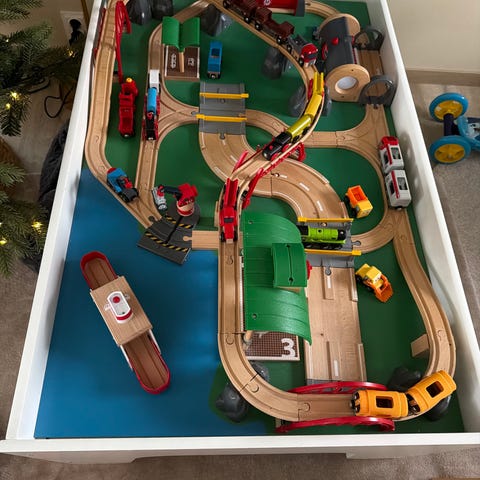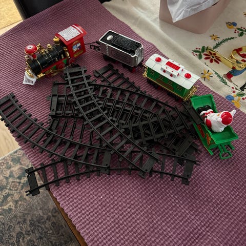 Juletema Togsett med tilhørende skinner. Togsettet inneholder lokomotiv, vogner og juledekorasjoner som reinsdyr og julenissens slede. Passer til barn som liker tog og juletema leker.
