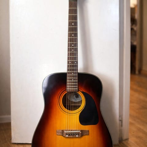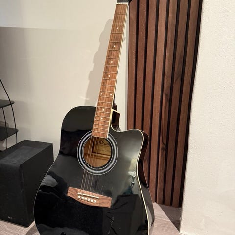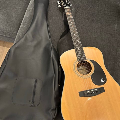 Epiphone akustisk gitar med sunburst finish. Gitaren har en cutaway design som gir enkel tilgang til de øvre båndene. Leveres med beskyttende gitarbag.
