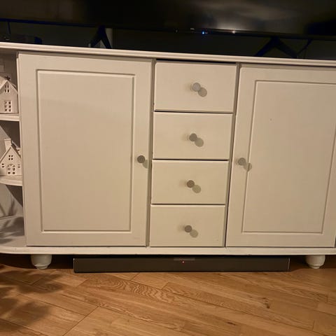 Brukt tv benk / sjenk gis bort, må hentes. Malt mørk blå. Det er tatt hull bak til ledninger/ kontakter.