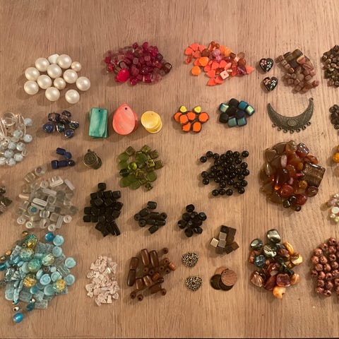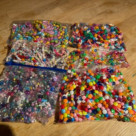 Assortert samling av perler i ulike farger som blå, grønn, svart, rød og hvit. Perlene varierer i størrelse og materiale, inkludert plast og perlemor. Pakken inneholder flere poser med perler, egnet for smykkelaging og hobbyprosjekter.