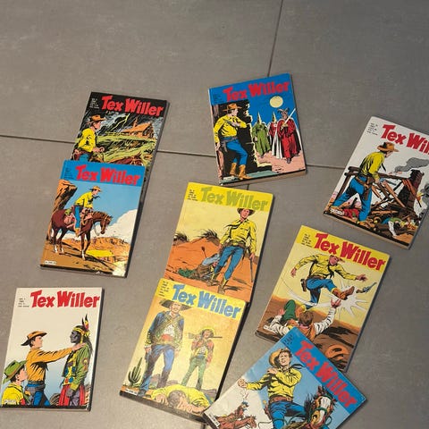 Tex Willer Ukjente Historier tegneserie, samling av flere bind med western-tema. Inneholder historier som "Kveldajongens hemmelighet", "De to desertørene" og "Rancho Sangriento". Passer for lesere interessert i western og tegneserier.kr 20 pr stk. nr 3 solgt