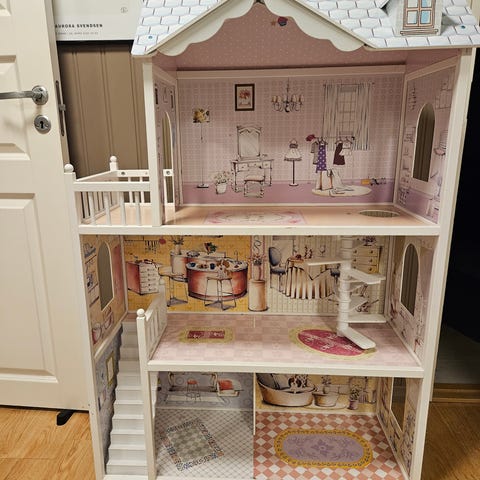 Selger et Flisat dukkehus fra IKEA med møbler som vist på bildene. Ny pris for alt var 900 kr. Huset har et par bruksmerker/hakk og klesskapet mangler en dør. Kan også henges opp. Må hentes i Bodø.