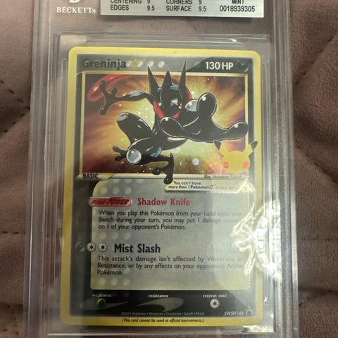 Pokemon Charmander samlekort med holografisk design. Kortet er innkapslet i beskyttende plast fra Beckett med vurdering for tilstand og autentisitet.