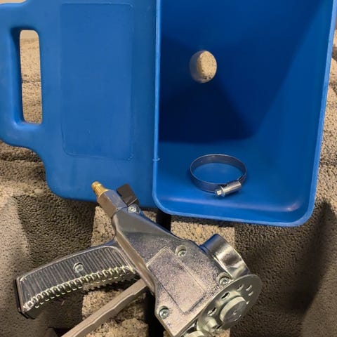 Skum- og sprøytepistol med lang dyse, laget av metall og plastmaterialer. Pistolen er designet for påføring av skum eller andre sprøytemidler, med et håndtak for enkel bruk og en lang dyse for presis påføring.