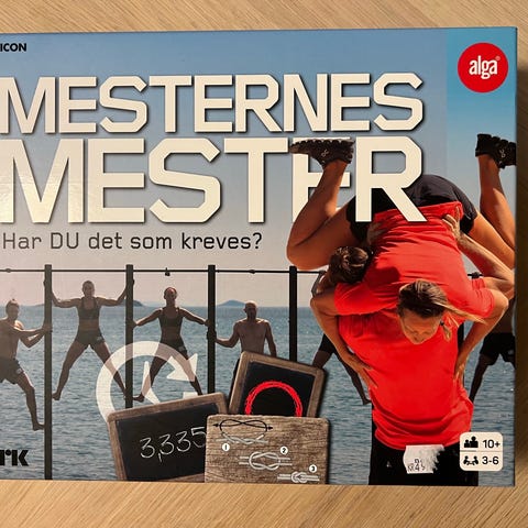 Alga Mesternes Mester brettspill med konkurransekonsept og ulike utfordringer. Inneholder spillebrett, kort, ledninger og instruksjonshefte. Passer for flere spillere og kan brukes til underholdning og konkurranser.