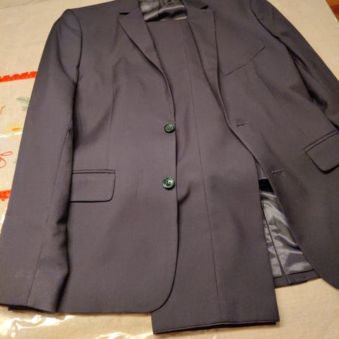 Bukse og jakke fra Cubus i 170. Skjorte fra Kappahl følger med, 170 i størrelse.