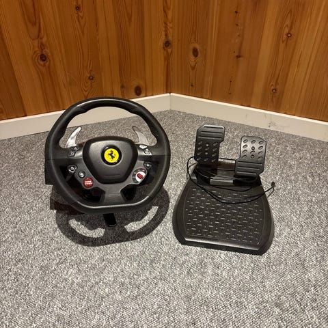 Thrustmaster T80 Ferrari GT Edition ratt. Svart farge med Ferrari-logo. Designet for racingspill med pedal- og rattkontroller. Passer til brukere som ønsker en realistisk kjøreopplevelse.