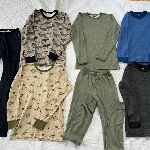 Mange fine ullklær. Mye bruk igjen. Merk: to av tightsene har hull i seg (de to til venstre på bildet), og følger derfor med gratis (om ønskelig).
