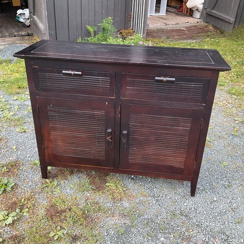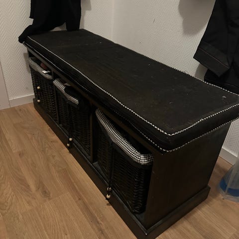 En skuff og 3 skap med en hylle i hver. Solid og stødig.