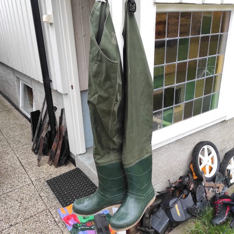 Flyteplagg 50 til fiske og båtliv fra Nemo Classic Diving A/S (se bilde). Mørk blå vinterbukse med seler og lommer foran, str M, foret, tror den er i nylon.