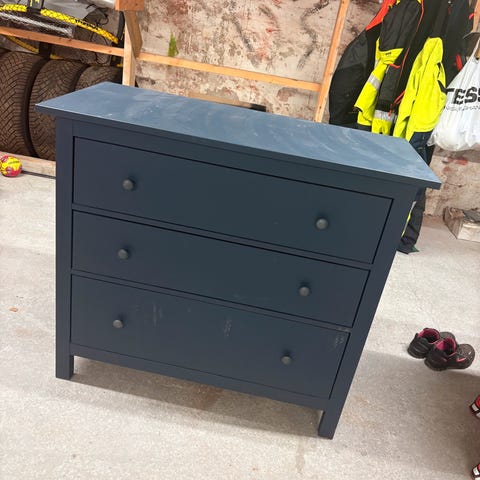 Kommode fra ikea. Det er skåret ut et lite hull bak for å passe foran en stikkontakt og skåret litt i bakbena for å få den til å passe over en list. Det har ingenting å si for bruken og det vil ikke vises hvis den står inntil en vegg. Den er ellers i god stand og skuffene er hele og fine og glir godt på plass :)