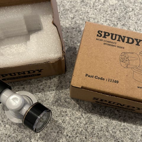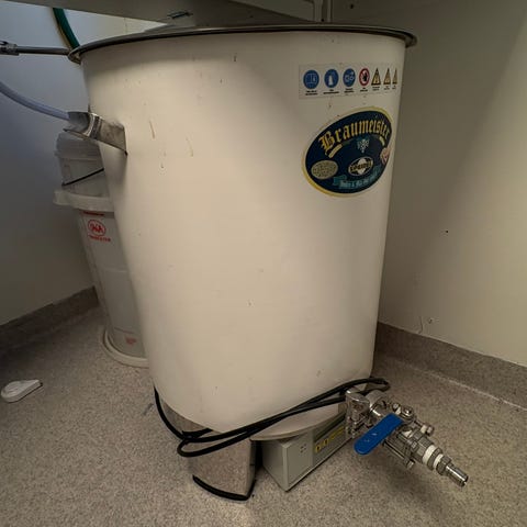 19l Corneliusfat, Co² flaske m/regulator + extra flaske, 30l gjæringsdunk, Grainfather meskeskje, Chemsan desinfiseringsmiddel og en Grifo korkemaskin som gjør korking til en lek. Dette er ei dyr robust presse.