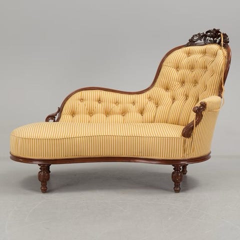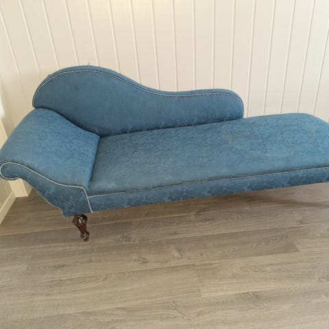 Antikk og vintage chaiselong med beige mønstret stofftrekk. Mål: lengde 163 cm, bredde 70 cm, sittehøyde 50 cm, rygg høyde 87 cm. Forsterket fjærer under setet. Mørkbeiset bein