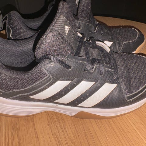 Adidas barnesko for unisex i størrelse 33. Skoene er svarte med hvite detaljer og har en gummisåle. Egnet for innendørsbruk.