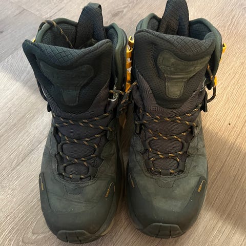 Hoka støvler i størrelse 43. Støvlene har en robust såle med godt grep, egnet for utendørs bruk. Fargen er hovedsakelig grå med gule detaljer. Designet for komfort og støtte ved ulike aktiviteter.
