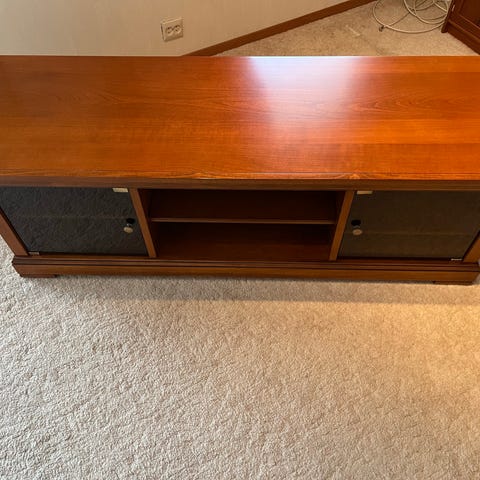 TV-benken er pent brukt og godt bevart, med god oppbevaringsplass og vitrinedel.