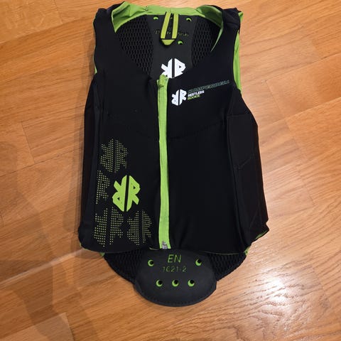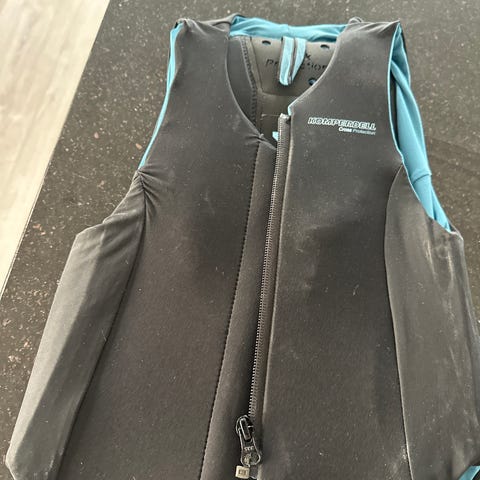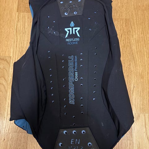 Komperdell Cross Protection størrelse 128, fargene svart og blå. Vesten har glidelås foran. Godt brukt, men fungerer fortsatt.