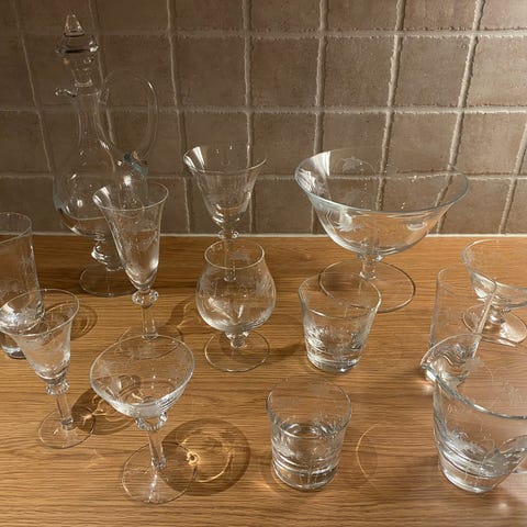 Mange forskjellige krystallglass med blåklokke mønster. Hvilket type glass og hvor mange det er av de står under: