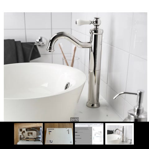 IKEA VOXNAN servantkran i krom. Produktet inkluderer kran, tilkoblingsslanger og monteringsanvisning. Designet for bruk på servant med standard installasjon.