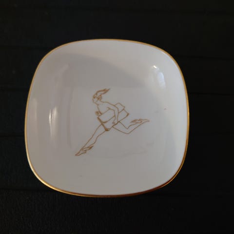 Skål i god og hel stand, uten skår. Hvit m/gullkant og -dekor, str 7,3 cm kvadratisk.