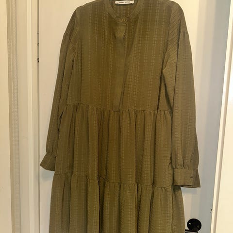 Pent brukt kjole fra Samsøe Samsøe. Kan brukes som jakke/kåpe grunnet knapper hele veien på fremsiden. I mørkeblå, ser ut som kordfløyel. Pent brukt