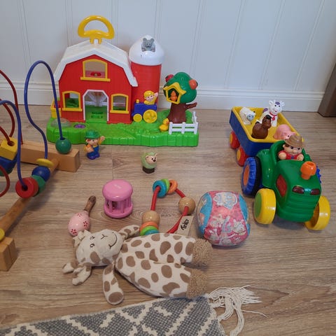 Leker til barn/jente. Topper til jente. Noe interiør.