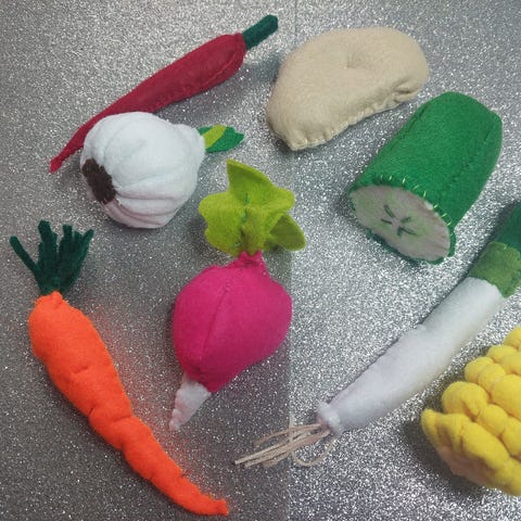 Lekefrukter og grønsaker i tre med kniv og skjærebrett