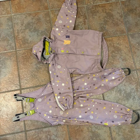 Pent brukt Kattnakken plask regnsett størrelse 92. Brukt av vårt barn fra 2-2,5 årsalder, grunnet sesong. Pent brukt, kun nor fargeforskjell på buksa, som er lite synlig. Ingen hull. Ser nokså nytt ut. Se bilder.