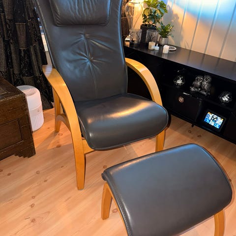 Flott lenestol i brunskinn. 2 år gammel men ser ut som ny. Må hentes.