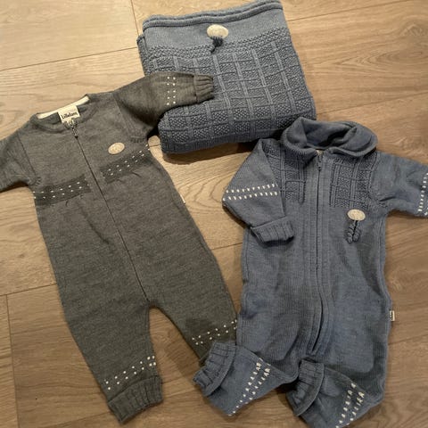 Ulldressen er i str 68, lue i str 44-46 og sokker/tøfler i str 62-68.