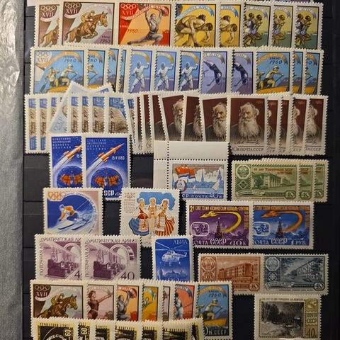 Innstikkbok 16 sider full med forskjellige frimerker fra CCCP. Stemplet. Se bilder som viser alle merkene. Hentes på Jessheim eller sendes mot forhåndsbetaling pluss porto. Porto kr 80,- som sporbar postpakke. Se også mine andre annonser.