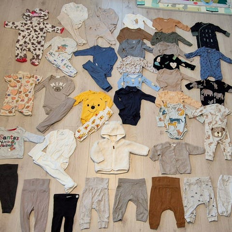 Stor klespakke str 62. Totalt 12 bodyer (en i ull) 1 genser, 2 pysjer og 12 bukser. Merker fra HM, Newbie, Name it, KappAhl, BeBe og Hust and Claire.