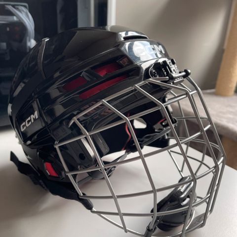 CCM ishockeyhjelm med gitter i svart farge. Hjelmen er designet for ishockey og tilbyr beskyttelse for hodet under spill. Gitteret gir ansiktsbeskyttelse samtidig som det sikrer god sikt.