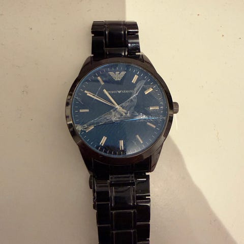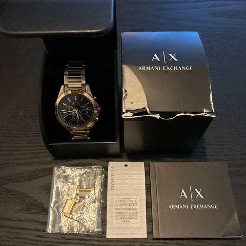 Armani herreklokke med svart urskive og gummirem. Klokken har kronograf-funksjon og datoindikator. Urkassen er i svart materiale med gullfargede detaljer på urskiven og knappene. Remmen er laget av svart gummi og har Armani Exchange-logo. Har desværre ikke klokkeboksen..pent brukt ingen synlige skader